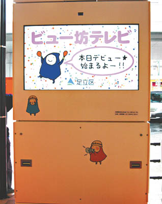 写真/災害用電子看板(通称ビュー坊テレビ)。普段は区の情報などを配信=北千住駅西口交番横で