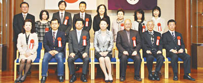 写真/区長と一緒に記念写真に納まった12社の代表者=区役所で