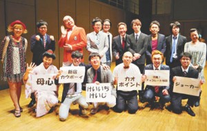 写真/本選出場の6組(前後一組)。左右・司会のニックス。後列左から5番目・宮田さん、6番目・おぼん師匠