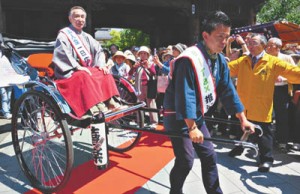 4月に足立朝日新聞「人」欄に登場した俥屋「喜楽」の川原辰也さんが、今回は「e‐Tax推進大使」として活躍。夏を思わせる晴天の下、第十四中学校吹奏楽部(第26回全日本マーチングコンテスト「金賞」)の先導により、一日広報部長を委嘱された俳優の林与一さんを人力車に乗せ、西新井大師周辺を軽やかにパレードした。その様子を一目見ようと、大師界隈には沢山の見物客が押し寄せ、パレードは大成功に終わった。林さんは「吹奏楽部の先導で、人力車に乗ってパレードするなど普段体験できないことなので、一生の思い出。この辺りは、昔の風情が残っていてとても良い。古き良きものを残すのは大切なこと。これからも豆まきなどでぜひ来たい」と笑顔。