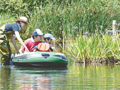 A7月27日(日)「探検!ため池ボートクルーズ」2005年に桑袋小学校跡地に作られた桑袋ビオトープ公園(花畑8‐2‐2、TEL3884・1021)。この公園は人の手によって生き物を持ち込むのではなく、環境を整えることで、生き物たちが自然と集まり暮らすことをめざしていく公園だ。