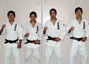 写真/左から樋口くん、中山くん、泊くん、藤阪くん=足立学園柔道場で