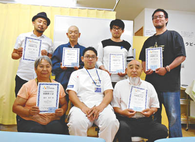 写真/6月の勉強会で「交通事故専門士初級修了書」を受けた皆さん。中央は鈴木代表=谷在家3丁目の「すずき整骨院」で