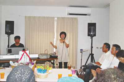 友永さんは、「地域の人が、楽しく交流できる場を」との思いで、コミュニティサロンの開設をコツコツと準備してきた。商店会のあるバス通りにちょうど良い場所を見つけ、みんなの協力で半年前に「まんてん工房」をオープンした。この日は、25人が参加。音楽ユニット「和音」のミニコンサートを中心に盛り上がり、後半は手話を交えて「夏の思い出」など10曲近くをみんなで歌った。