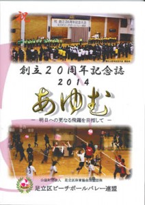 昨年、めでたく20周年を迎えた足立区ビーチバレーボール連盟(山口計夫会長)が、このたびA4、フルカラー120頁の20周年記念誌「あゆむ―明日への更なる飛躍を目指して―」を作成(写真)。