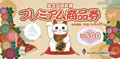 足立区商店街振興組合連合会では、10%のプレミアムが付いた足立区内共通プレミアム商品券を10月26日(日)から発売する。区内約50商店街加盟店舗、一部コンビニエンスストアなど約1600店舗で利用できる。