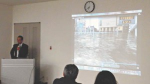 講師は元東京都職員の土木専門家で、「首都水没」(文藝新書)の著者、土屋信行氏。冒頭で荒川が氾濫した時のシミュレーション動画を公開。北千住駅西口の水位は7・25mとなり、ペデストリアンデッキが水に浸かる衝撃的な様子に参加者から驚きの声が上がった。土屋氏は江戸の古地図や荒川放水路掘削の写真などを交え、足立区の土地の特徴を説明。3・11で都内の堤防が一部壊れたことや無防備な地下鉄入口など、首都の水害対策の脆弱さを挙げた。「予想していた雨量を超えれば、絶対に決壊し洪水になる。ならなければ運がいいだけ。台風は絶対来るものと思って行動すること」と説き、防災グッズにライフジャケットを加えることなどをアドバイスした。