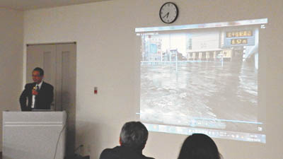 講師は元東京都職員の土木専門家で、「首都水没」(文藝新書)の著者、土屋信行氏。冒頭で荒川が氾濫した時のシミュレーション動画を公開。北千住駅西口の水位は7・25mとなり、ペデストリアンデッキが水に浸かる衝撃的な様子に参加者から驚きの声が上がった。