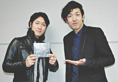 写真下/デビューCD「WHITE of CRIME」を手に、Takumi(左)とTakeshi=都内事務所で
