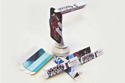 単独開発部門で大賞を受賞したのは㈲プリントアート(西竹の塚2‐15‐21、TEL5647・0306)の「携帯万華鏡パンジー」。同製品は、携帯電話やスマートフォンのカメラのレンズにミラーの三角をあてがうことで、見るもの全てが万華鏡として見れたり、撮影したりできる楽しいノベルティ商品。