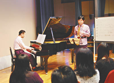1日目は児玉真氏(地域創造プロデューサー)と榎本広樹氏(新潟市芸術文化振興団)による、アウトリーチの意義や心得、プログラムの作り方などの座学。2日目はサックス奏者の田中靖人氏と足立区在住のピアニスト・白石光隆氏が、受講生を小学4年のクラスにみたてて、デモンストレーションを行った。参加者たちは2人のわかりやすく楽しい話術を学びながら、贅沢なミニコンサートを堪能した。