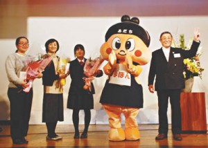 原案は、応募総数約150通の中から昨年2月に千住中居町在住の小林みゆきさんが描いたキャラクターに決定。その後の募集には約800通の名前が寄せられ、審査の結果、大谷田在住の金城綾乃さん、中川在住の佐藤慶子さん、東保木間在住の石井晴菜さんの3人が考えた「がまぽん」に決まった。それぞれに区内共通商品券が贈られた。
