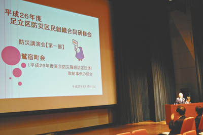 防災講演会では平成25年度東京防災隣組に認定されている鷲宿町会の有馬康二会長、本木一丁目南町会の礒谷義則防災部長が、それぞれの取り組みを紹介。鷲宿町会は独自に本人の同意を得て災害時要援護者のリストを作成し、同居家族、緊急連絡先、杖の有無、寝室の位置などを把握。災害時協力者も登録している。