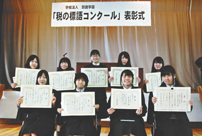 潤徳女子高校(木村美和子校長)の生徒たちが、平成26年度「税の標語コンクール」に初めて参加。優秀な作品が多く、1月8日(木)、始業式前に同校体育館で表彰式が行われた。主催は足立間税会(齋賀正信会長)。