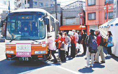 乗車には「花めぐり手形(缶バッチ)」が必要で、料金は中学生以上300円。2日間有効で乗り降り自由、当日バス停で購入できるほか、足立区役所南館4階の観光交流協会窓口で4月1日(水)~3日(金)事前購入も可能。運行時間は午前9時~午後4時。東は15分に1本、西と中央は20分おきに1本バスが走る。