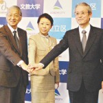 中/左から文教大学・野島正也学長、近藤区長、文教大学・渡辺孝理事長=区役所で