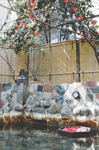 昭和23年創業で、平成8年に「東京一大きい露天風呂を」と設置。男女日替わりで利用できる。桜、バラ、椿、楓などの樹が湯船をぐるりと囲み、昼間は鳥のさえずりが降り注ぐ。花のない時期も、2代目店主の堀田勲さんが育てた菖蒲や菊の鉢が楽しめる。お客さんには「伊豆に来たみたい」と喜ばれるとか。露天の屋根を覆う大きな夏みかんの樹から、今年は600個の実を収穫。女将の澄子さんがママレードにして配るそうだ。