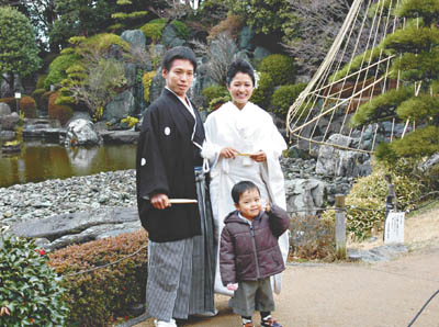 写真/披露宴前に庭園で記念撮影に応じた長谷川夫妻=花畑庭園で