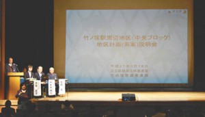 駅前広場、都市計画道路の整備に合わせて、竹ノ塚駅を中心とした約42ヘクタールの地区を対象としたもの。平成26年3月に策定した「竹ノ塚駅周辺地区(中央ブロック)地区まちづくり計画」に基づいて、「にぎわいのある安全・安心なまち」を目標に、建物の建て方や土地の使い方などの地区計画の素案を区が作成した。地区を駅前、幹線道路沿道、にぎわい誘導、住宅地など6つに区分。現在は踏切で分断されている東西の回遊性を促進することによるにぎわいの創出、建て替え時のセットバックによる防災性の向上などが盛り込まれている。説明後、参加者から高架下ができることによる治安への不安を問う声や、駅名を地名と同じ「竹の塚」に統一して欲しいなどの要望が出された。また、同ホールを拠点に区民参加の「竹の塚劇団」の活動をしている山下芳子さんが、ソフト面としての文化の重要性を訴えるなど、活発な意見や質問が出された。