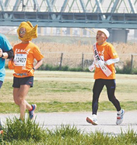 2年前にギランバレー症候群を患い、一時は社会復帰を諦めたが、2カ月半のリハビリで快復。「マラソンをやってたおかげで快復が早かった」。昨年から10㎞の練習を始め、「ラストラン。お土産だと思って」今回の参加を決めた。フルマラソンは10年ぶり。「1人は心配だから見守り隊を作った」と大野さん。この日のために作ったオレンジ色のおそろいのTシャツで、メンバー有志が小沢さんを囲んで伴走。「タイ(隊)ヤキ」の被りもののメンバーも。小沢さんは「私が主役です82才」のたすきをつけていたが、「タイヤキが人気で、(沿道の応援は)誰も私に声をかけなかった」と笑う。