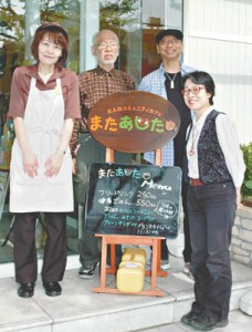 写真/左から太田店長、板倉代表、「和音」Shunさん、難波実行委員長=「またあした」前で