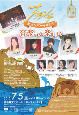 「みぢかで きがるに くらしっく」をモットーに、足立区フレッシュクラシックオーディションに合格した有志による団体「ブリランテ」――。年2回の定期コンサート(於・ギャラクシティ)、幼児向けオリジナル音楽劇による気仙沼でのボランティア演奏、幼稚園・保育園での演奏他、区内各施設での演奏活動などを精力的に実施。その高い音楽性による心に染み入る演奏と歌声は、人々の心のオアシスとなっている。