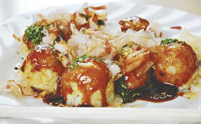 同店を営むのは、細谷義隆さん(67)とミヨ子さん夫妻。メニューは、たこ焼き(300円)、焼そば(同)、おにぎり(100円~)、ぎょうざ(200円)などバラエティ豊か。自慢のたこ焼きはキャベツのシャキシャキした歯ごたえと甘味がたまらない。