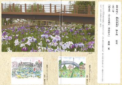 全42頁に収められているのは「あだち俳壇」や同法人の会報「あかしあ」(現「あいのわ」)に掲載してきた21句。秋山さんの句に合わせて、同じ題材で詠まれた著名な俳人(芭蕉など)の句、イメージの風景写真、それを元に描かれた施設利用者のイラストが掲載されている。