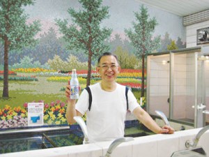 写真上/「そーだ!銭湯でサイダーを飲もう」と、ご主人の山田さん=若松湯の浴室で