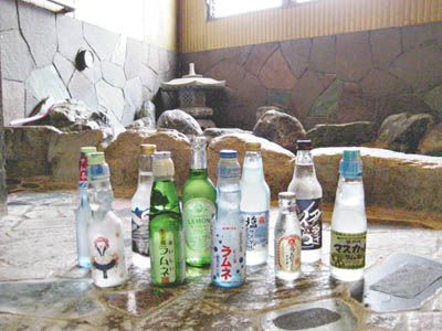 下/10種類の地サイダー・ラムネが楽しめる(後ろは漢方湯の岩風呂)