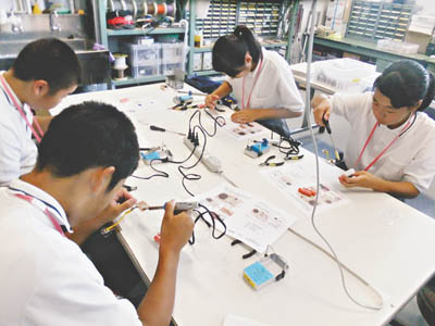 写真下/ハンダを使って回路を結ぶ体験をする4人=東京電機大学で