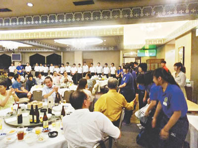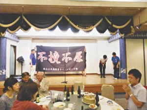 同日夕方、綾瀬駅そばの万来館で行われた「還暦」祝いの総会・懇親会は壮観。13回生で「小椋さんと飲んだこともある」という4代目会長の柴田五郎さん(78)を始め、歴代の同校バレーボール部の面々が全国から110人も集まった。会では、「不撓不屈」「一意専心」と書かれた横断幕が倶楽部から現役キャプテンに贈呈されたり、会場で現役への温かいカンパが募られたりして、大いに盛り上がった。