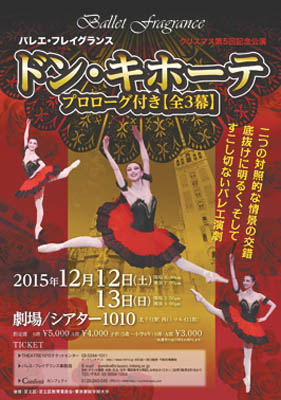 シアター1010のクリスマスの風物詩として好評を博する「バレエ・フレイグランス」(代表=中原由美子)による公演が、この12月、第5回を迎える。今年は、その記念公演として「ドン・キホーテ」(プロローグつき全3幕)を上演する(後援=足立区、区教委、東京家政学院大学)。