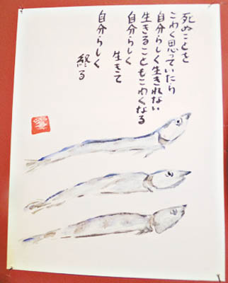 「最初は、下手くそもいいとこで、言葉もひどかったんですよ」と金子さん。でも、「困難や苦しみを乗り越えることで人は大きくなる」の言葉通り、金子さんの絵手紙は、独自の輝きを増していった。3匹の痩せたイワシの絵に添えて「死ぬことをこわく思っていたら 自分らしく生きれない 生きることもこわくなる 自分らしく生きて 自分らしく終わる」の言葉。