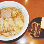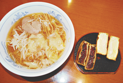 オススメは、もっちりとした生地の今川焼とあっさり味の中華そば。今川焼の餡は①あずき(つぶ)②しろあん(こし)③カスタードクリーム④くろごま(こし)⑤チーズ⑥季節限定の6種類(1個100円~)。中華そばは「五目そば」(850円)や「えびそば」(900円)、「ワンタンメン」(750円)などが人気。一緒に無臭ニンニクを使った薄皮の焼き餃子(5個300円)もどうぞ。