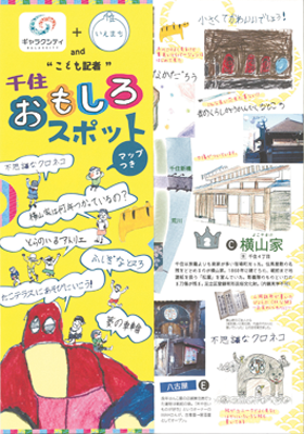 昨年11月に行われた西新井ギャラクシティと民間の「千住いえまちプロジェクト」のコラボ企画による千住こども探検隊「発見!千住おもしろスポット!」(1月5日号に記事掲載)で、子ども記者11人が取材したまちの見どころをまとめたもの。8000部作成。2時間をかけてまちを歩いた子ども記者が撮影した写真や記事をもとに作成された紙面は、好奇心に溢れている。直筆の感想も散りばめられ、素直で温かいマップになっている。