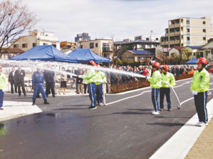 オープニングには、近藤区長、高山区議会議長、地元都・区議、町会関係者、住民らが参加。千寿青葉中学校(野辺隆志校長)の8人の中学生消火隊や千住消防団第5、6分団が放水を披露したほか「非常食+やさい」が配布された。