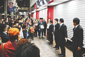 「57年間のご愛顧ありがとうございました」――挨拶文の掲げられたザ・プライス千住店の店先を埋め尽くした200人を超える人々。4月10日(日)午後8時過ぎ、最後の客を送り出し深々とお辞儀をする店員たちに、大きな拍手が贈られた。