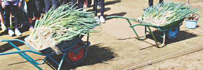 2台の一輪車に山盛りになったネギに「ハンバーグを作るときの匂い」と、うれしそうな声も。日々の世話をしてきたボランティアの室井セツ子さん(82)と斉藤和美さん(74)も、子どもたちの喜ぶ姿に目を細めていた。