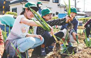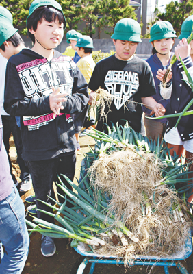 「千住ネギ」の収穫が4月、栗原北、平野、千寿双葉の区内3小学校で行われた。