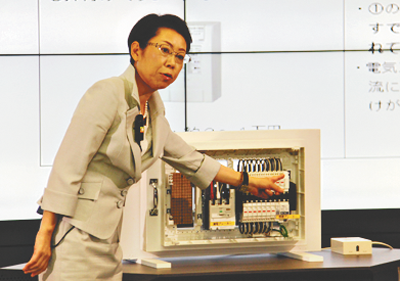 写真/会見で感震ブレーカーの説明をする近藤区長