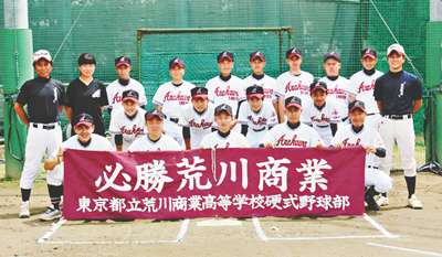 都立荒川商業高校/小台2-1-31、TEL3912・9251【部員】18人(3年5人、2年5人、1年7人、マネージャー1人)【監督】石川和也(53)【コーチ】大野豊司【キャプテン】山地湧大(3年・二塁手、抑え投手)