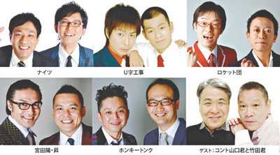 出演は、漫才協会が誇る「ナイツ」、栃木弁全開のスピード漫才「U字工事」、ボケとツッコミのタイミングが絶妙な「ロケット団」と「宮田陽・昇」、不思議なムードの「ホンキートンク」、名づけて「漫才BIGファイブ」。サブタイトルに「亀有発信! とびっきり漫才大集合★家族で笑おう!」を掲げ、さらにパワーアップした笑いを届ける。ゲストはコント山口君と竹田君。5組プラスワンのナマの迫力をぜひご堪能あれ!ナイツの塙から朝日読者に次のメッセージ。