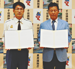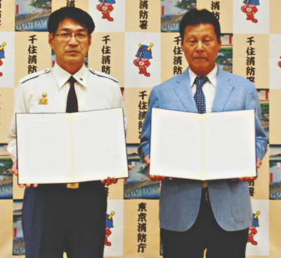 写真/協定書を手に遠藤理事長(右)と鈴木署長=千住消防署で