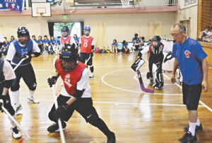 写真上/「きさらぎ」に所属する知的障害者チームがフロアーホッケーの練習試合を実施=辰沼小体育館で