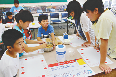 2時間目は、カルビーのフルーツを使ったシリアル商品「フルグラ」(フルーツグラノーラの意味)を実際に試食。班ごとに話し合ってバナナやチョコチップなどのトッピングを選んで牛乳やヨーグルトに混ぜ、簡単朝ごはんに挑戦。「おいしい」「これから朝ごはんを食べたい」と笑顔がこぼれた。