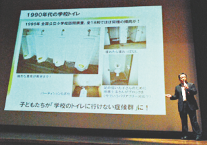 7月26日(火)、足立区役所庁舎ホールで東京土建一般労働組合足立支部主催の「あだちトイレサミット」を開催。「今、緊急に求められている学校トイレの改善」をテーマに「学校のトイレ研究会」の河村浩事務局長、木村基治主任研究員、井尾加奈子研究員が講演した。