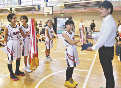 大会は男子11、女子10チームが参加。男子の決勝戦は、渕江クラブを50対35で破ったブルースカイと、扇MAXを44対41で破った関原ダンクが激突、突破力とシュート力でまさるブルースカイが52対39の大差で関原を下し優勝した。