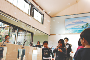 消しゴムハンコによる手拭い作り、ハーブ石鹸作りに挑戦した後は、洗い場でシャボン玉を飛ばして遊び、歓声と笑顔が弾けた。イベント後、一番風呂を楽しむ参加者もいて、初めて銭湯に来たという小6と小4の兄妹は、「また来てみたい!」と目を輝かせた。