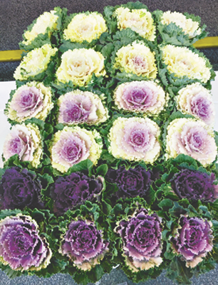 榎本さんのハボタンは、4色の花色が鮮やかに発色し、葉の枚数も多くて完成度が非常に高い。また、最近の不安定な気候条件の中で、出にくい紫色の発色も素晴らしい点が評価された。
